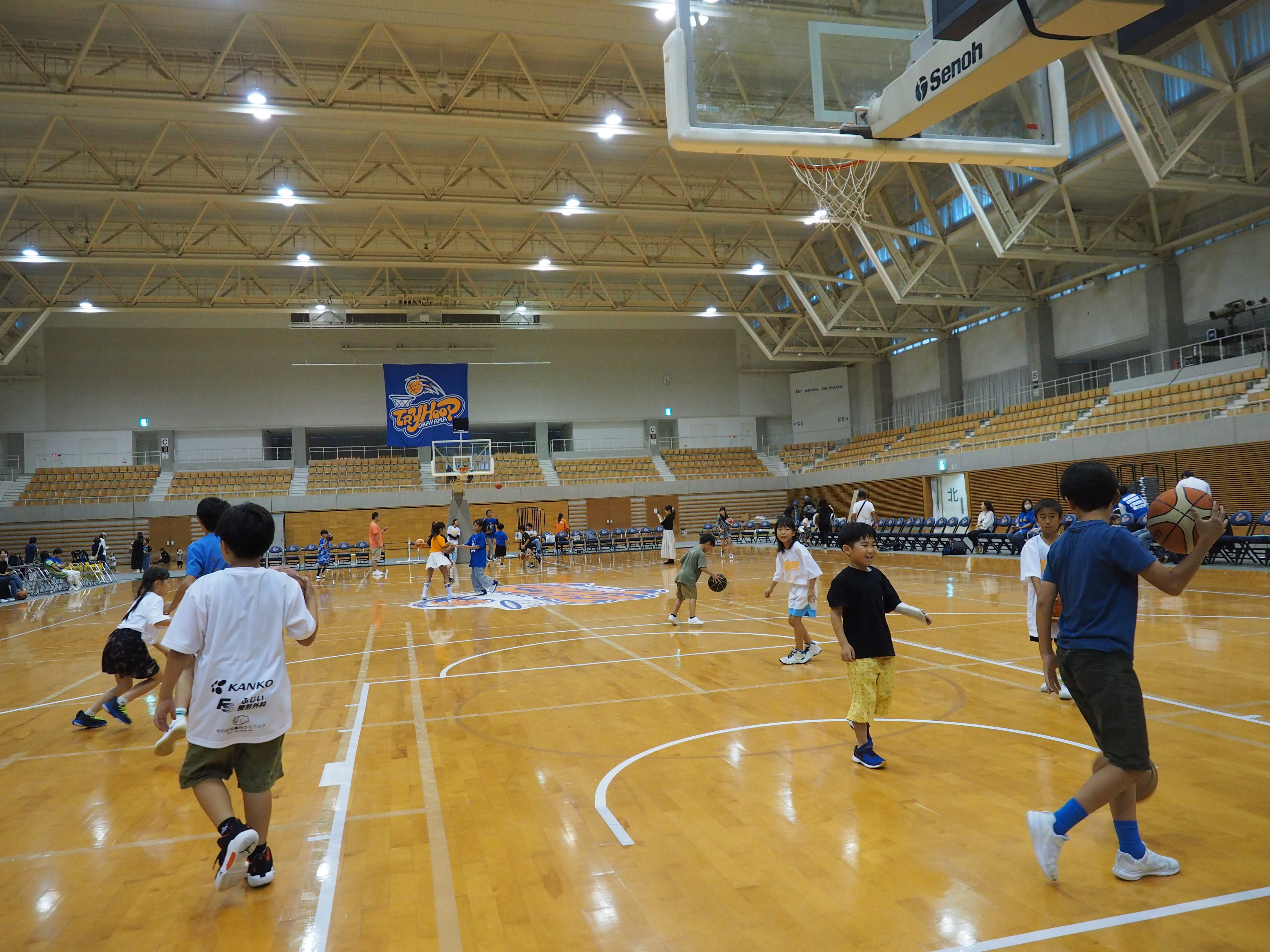 1階フロアにバスケットボールゴールを設置し、シュートが入った方にはトライフープ岡山のグッズをプレゼント(数量限定)。