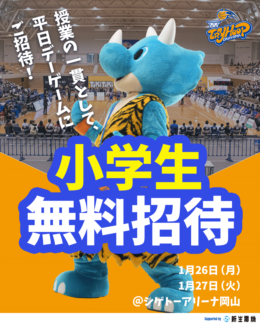 このたびトライフープ岡山では、学校授業の一環として、岡山市内の小学生を2026年1月26 日・27日に開催する試合に招待いたします。 小学生招待実施 詳細