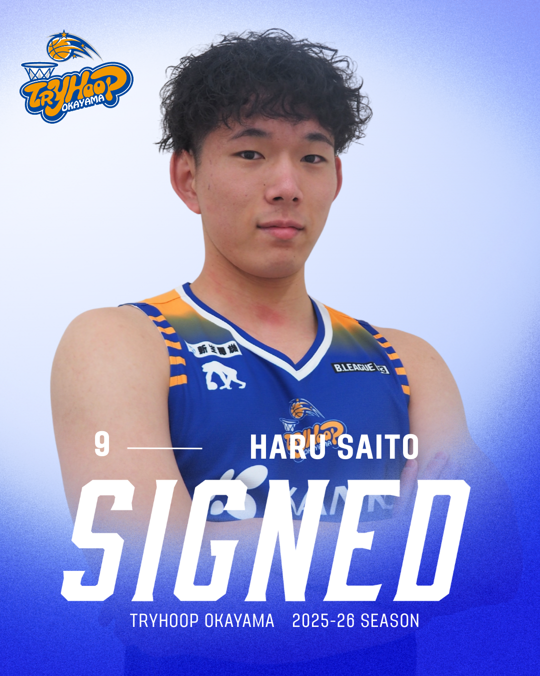 齋藤選手個人としてのステップアップはもちろんのこと、今シーズン所属の山梨学院大学の関東リーグ2部優勝と1部昇格に貢献した勢いで、トライフープでもチームに勢いを与えてくれることを期待しています。